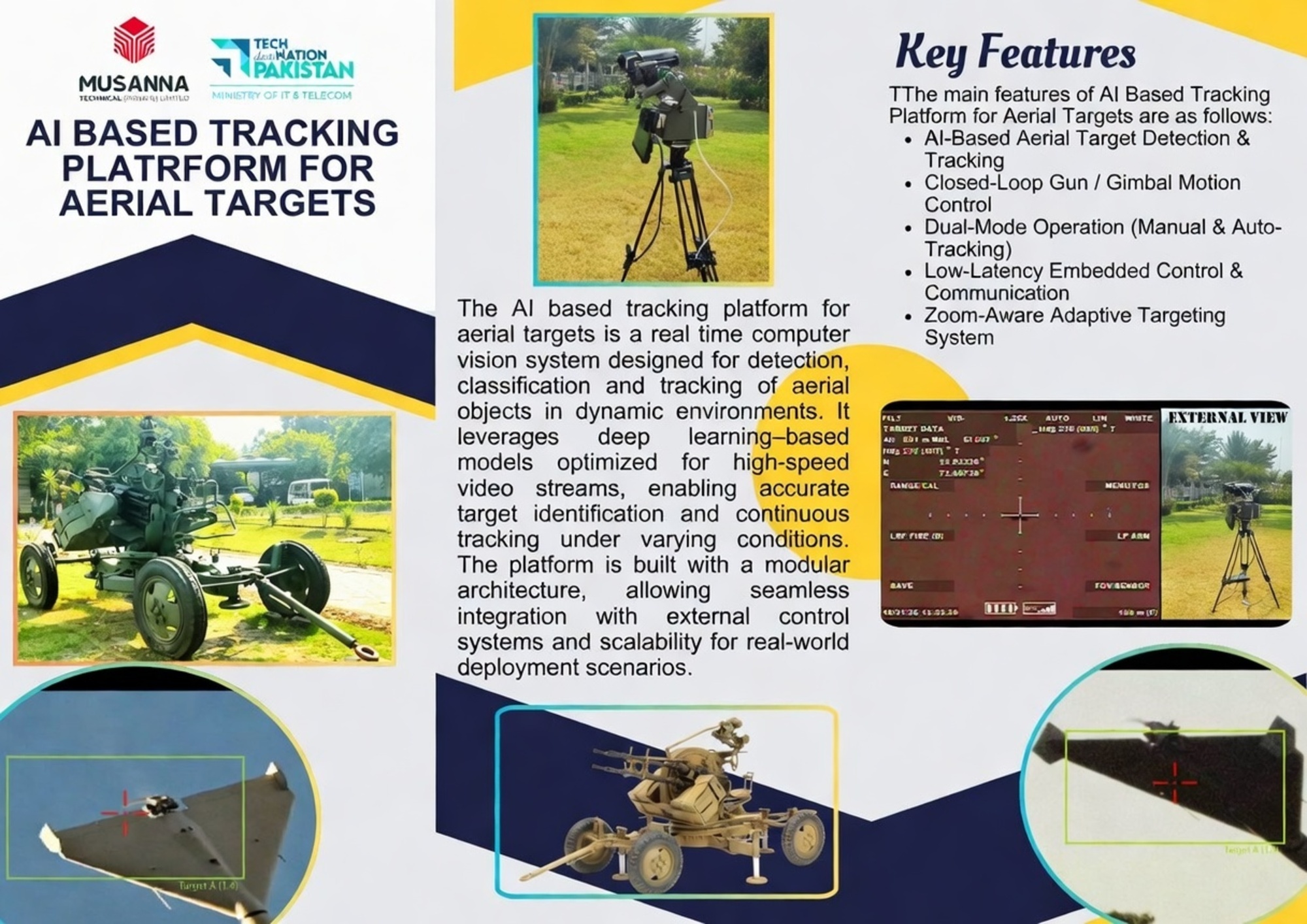 The AI-based tracking platform for aerial targets is a real-time computer vision system designed for detection, classification and tracking of aerial objects in dynamic environments. It leverages deep learning-based models optimized for high-speed video streams, enabling accurate target identification and continuous tracking under varying conditions. The platform is built with a modular architecture, allowing seamless integration with external control systems and scalability for real-world deployment scenarios.